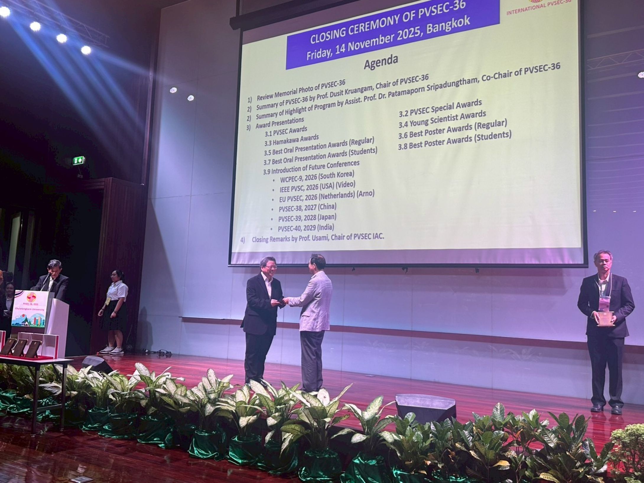![]() | ดร.ธีรยุทธ์ เจนวิทยา รับรางวัล PVSEC Award 2025 ศูนย์พัฒนามาตรฐานและทดสอบระบบเซลล์แสงอาทิตย์ (CSSC) สถาบันพัฒนาและฝึกอบรมโรงงานต้นแบบ (สรบ.) มหาวิทยาลัยเทคโนโลยีพระจอมเกล้าธนบุรี (มจธ.) ขอแสดงความยินดีกับ ดร.ธีรยุทธ์ เจนวิทยา ที่ได้รับ รางวัล PVSEC Award 2025 จากงานประชุมวิชาการระดับนานาชาติด้านพลังงานแสงอาทิตย์ PVSEC-36 ซึ่งจัดขึ้นเมื่อวันที่ 9–14 พฤศจิกายน 2568 ณ จุฬาลงกรณ์มหาวิทยาลัย ประเทศไทย |